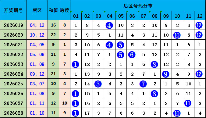 后区走势分析:上期开出01 10,开出和值11,较前一期和值下降1个点位变化,本期预测和值上升,参考号码06 12,和值18。